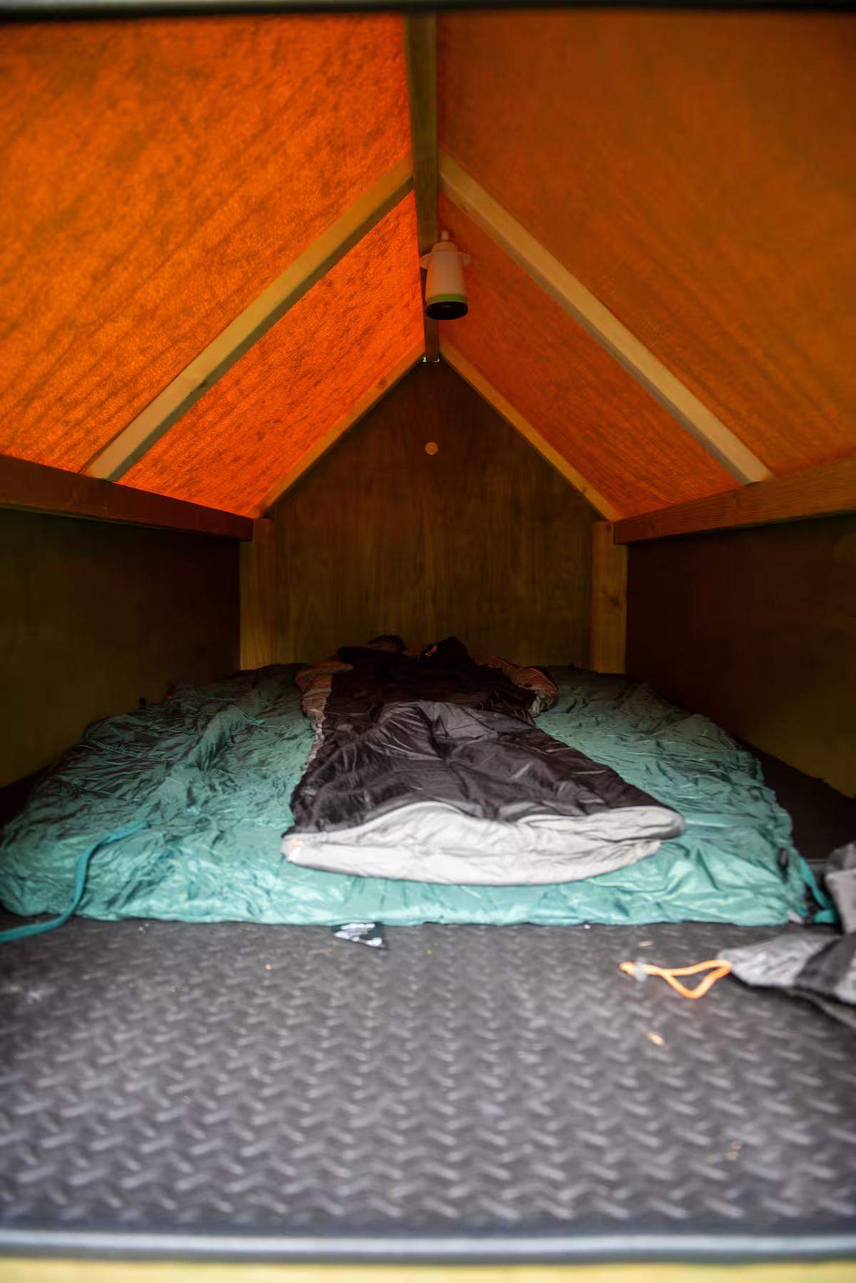 The space is about the width of a double bed, the tent box is large enough to snugly sleep two campers, with room by the door for bags and kit.